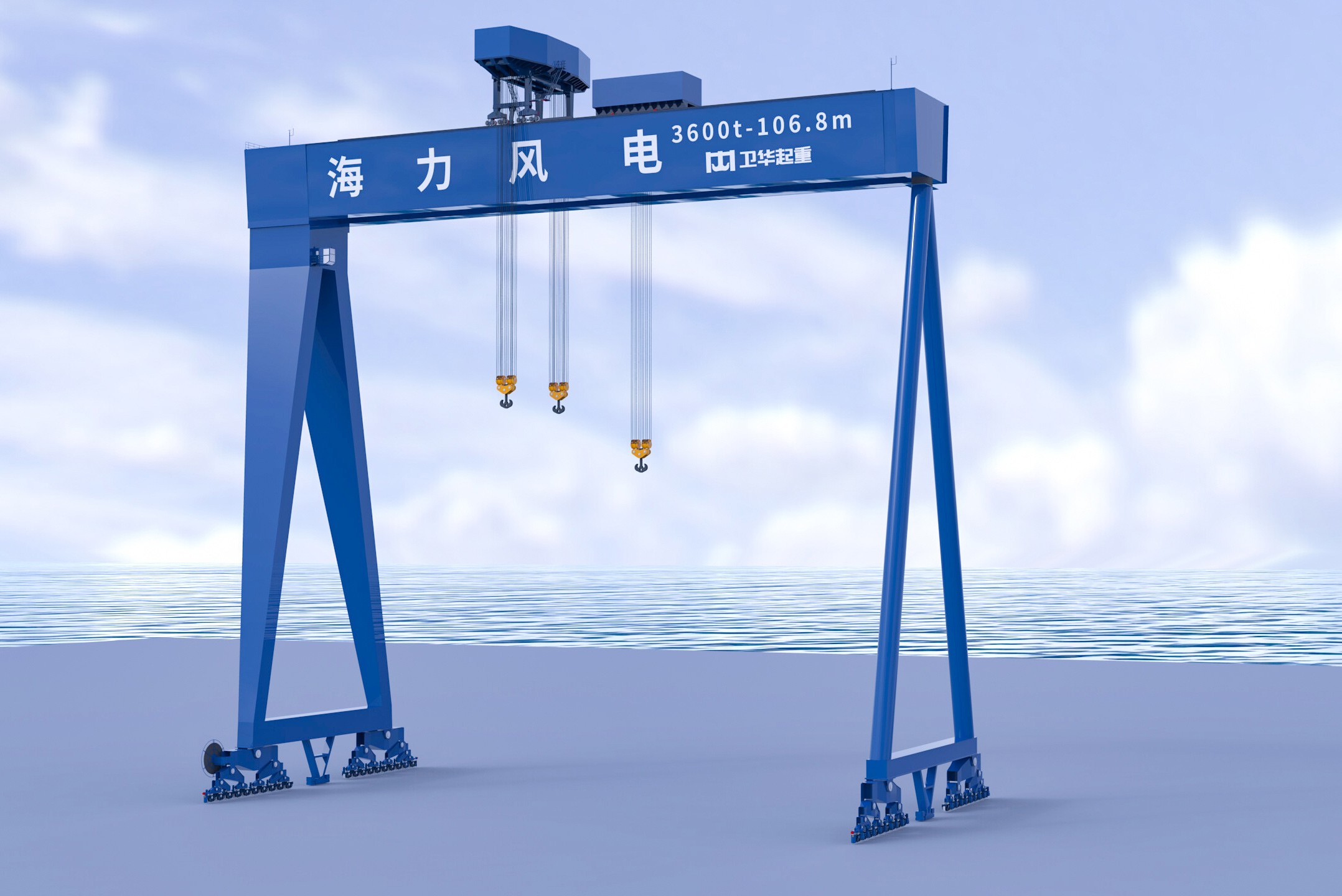 3600噸門式起重機采用雙小車系統,起升機構為四卷筒雙鉤同步結構,單個小車起升能力為1800噸,總起重量3600噸,起升高度128m,整機小車具有單鉤吊、雙鉤抬吊、三鉤抬吊等多種起重組合,可用于大型鋼構對接、吊運等多種施工作業,為全球首臺套龍門起重機。